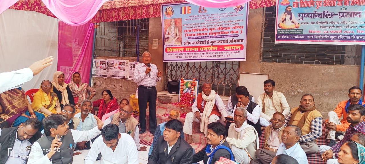 आज दिनाक 3मार्च 2024को रायबरेली शहर में निकट हाथी पार्क के पीछे मोहल्ला रफी नगर (अहमद पुर नजूल) में स्थित रैदास समाज का वर्षों पुराना सन्त शिरोमणि गुरु रविदास मन्दिर (रैदास आश्रम सामुदायिक केंद्र) को स्वार्थीतत्व, दबंग भूमाफियाओ द्वारा अवैध तरीके से कब्जा और तालाबंदी कर रैदास समाज और रैदास अनुयाईओ को मन्दिर के अंदर पूजा पाठ करने पर रोक लगाये जाने के विरोध में जनपद के रैदास समाज, बहुजन वादी, समता वादी, अम्बेडकर वादी,संविधान पसन्द, धम्म से जुड़े विभिन्न सामाजिक संगठनो के संयुक्त तत्वावधान में बहुजन नेता राजेश कुरील के नेतृत्व में सैकड़ों रैदास अनुयाइयों ने मन्दिर गेट पर विशाल धरना प्रदर्शन कर कड़ा आक्रोश व्यक्त कर देश के माo महामहिम राष्ट्रपति महोदय , माo प्रधान मंत्री महोदय, एंव उo प्रo के माo महामहिम राज्यपाल महोदय, माo मुख्यमंत्री महोदय से रैदास मन्दिर/आश्रम सामुदायिक केन्द्र को अवैध कब्जेदारो से मुक्त कराकर, मन्दिर का ताला खुलवाकर , समाजहित और जनहित में रैदास समाज की देख रेख में उक्त संस्था पर प्रशासक नियुक्त कर रैदास मन्दिर में पुन: पूजा पाठ करने एंव संचालित किए जाने की मांग किया। जिलाधिकारी महोदय रायबरेली के द्वारा मांग पत्र सदर तहसील की नायब तहसीलदार महोदया को सौंपा ज्ञापन। धरना प्रदर्शन की अध्यक्षता वरिष्ठ समाजसेवी राम सजीवन कोरी अध्यक्ष वीरांगना झलकारी बाई कल्याण एंव विकास परिषद् एंव संचालन बहुजन नेता विमल किशोर सबरा संयोजक मिशन जय भीम ने किया।