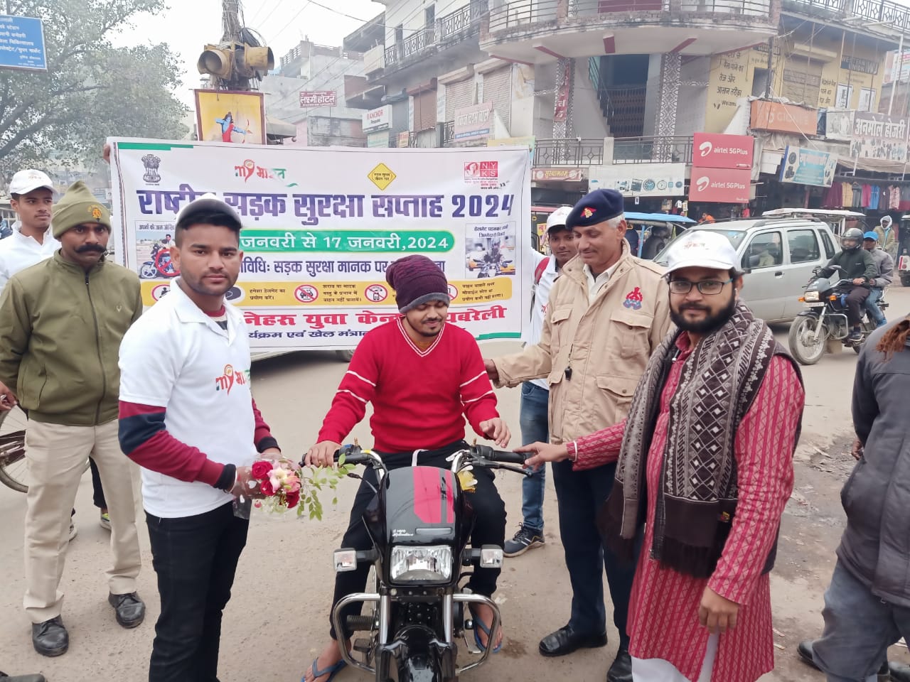 रायबरेली12 जनवरी 2024 नेहरू युवा केंद्र ने आज 12 जनवरी को जनपद इंटर कॉलेज हरचंदपुर में स्वामी विवेकानंद जी की 161वीं जयंती व युवा दिवस के अवसर पर स्वामी विवेकानन्द जी के जीवन दर्शन पर संगोष्ठी व सड़क सुरक्षा सप्ताह के अन्तर्गत यातायात नियमों पर जागरुकता कार्यक्रमों का आयोजन किया गया व साथ ही रायबरेली नगर के महत्वपूर्ण चौराओं व लाल बत्ती पर स्वयंसेवकों व यातायात पुलिस के समन्वय से सड़क सुरक्षा के मानकों पर आमजन को जागरूक किया गया व यातायात नियमों के उल्लंघन करने वालों को यातायात पुलिस व स्वयंसेवको ने रोक कर सड़क सुरक्षा नियमों के विषय में बताया और उन्हे पुष्पगुच्छ देकर भविष्य में नियमों के पालन हेतु समझाया गया। जिला युवा आधिकारी गोपेश पांडेय ने युवाओं को स्वामी विवेकानंद जी के आदर्शों और विचारों को पढ़ने व उन्हें जीवन में अपनाने व अपनी सामाजिक जिम्मेदारी को निभा कर भारत को 2047 तक विकसित भारत के दृढ़ संकल्प हेतु आह्वाहन किया गया ।