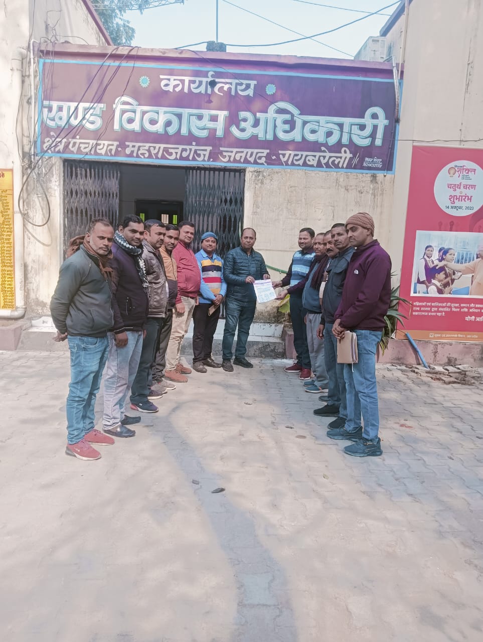 बता दें कि ग्राम रोजगार सेवकों द्वारा आठ सूत्रीय मांगों को लेकर संघर्ष किया जा रहा है, जिसमें मुख्यमंत्री योगी आदित्यनाथ द्वारा ग्राम रोजगार सेवकों एवं मनरेगा कर्मियों के संबंध में की गई घोषणाओं पर शासन आदेश निर्गत किए जाएं जिसमें जॉब चार्ट में अन्य कार्य जोड़ना रोजगार सेवकों की सेवा समाप्ति से पूर्व उपयुक्त मनरेगा की सहमति एच आर पॉलिसी लागू कराना हिमाचल प्रदेश राजस्थान मध्य प्रदेश की तरह मानदेय बढ़ोतरी की जाय ग्राम विकास अधिकारी भर्ती में 50% का कोटा ग्राम रोजगार सेवकों के लिए आरक्षित किया जाए कोविड के अतिरिक्त आकस्मिक दुर्घटना से मृत्यु होने पर उसके आश्रित को सेवा में समायोजित किया जाए जैसी अन्य मांगे शामिल हैं, रोजगार सेवक सतेंद्र त्रिपाठी अविनाश मिश्रा, मोहिनी वर्मा, रामदेव देश राज रावत, सुरेश कुमार सहित आदि ने बताया कि प्रांतीय आवाहन पर रोजगार सेवकों के हित में मांगे पूरी ना होने पर तीस जनवरी को इको गार्डन लखनऊ से मुख्यमंत्री आवास तक कूच किए जाने का कार्यक्रम प्रस्तावित है, उसी की सूचना खंड विकास अधिकारी महराजगंज को लिखित रूप से दी गई है।