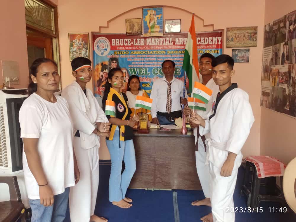 सहारनपुर। मिशन स्वस्थ भारत एवं आत्मरक्षा नंदकिशोर दिनांक 15 आठ 2023 को 77 वा स्वतंत्रता दिवस के उपलक्ष मैं ब्रूस ली मार्शल आर्ट एकेडमी रजिस्टर्ड एवं आदित्य नंदकिशोर फिल्म प्रोडक्शन द्वारा झंडारोहण कार्यक्रम अहमद बाग सेल टैक्स ऑफिस के सामने अरोड़ा पुस्तक भंडार वाली गली कोर्ट रोड सहारनपुर में बड़ी धूमधाम से संपन्न हुआ इस अवसर पर ग्रांड मास्टर नंदकिशोर ने झंडारोहण करते हुए बताया कि हमारे अंदर देशभक्ति का जज्बा होना चाहिए मार्शल आर्ट से हमें सेल डिफेंस आता है नवयुवक युवतियां अपनी आत्मरक्षा स्वयं कर सकती हैं योगा से हम अपना फिजिकल फिटनेस ठीक रख सकते हैं जिससे कि अनेक रोगों से छुटकारा मिलता है डांस से भी हम स्लिम रहते हैं एवं अपने आप को एक्टिव महसूस करते हैं गीत संगीत से भी माइंड फ्रेश रहता है श्री किशोर ने कहा कि इनमें से कोई एक एक्टिविटी हर मनुष्य को रखनी चाहिए जिससे आप जीवन भर अपने आप को प्रफुल्लित रख सकें अपने जीवन को खुशहाल रख सकें इस अवसर पर कार्तिक अंकुर गणेश बबली वंश सेल्फ डिफेंस का सुंदर प्रदर्शन किया योगा के बारे में एकता ने कहा कि सर्फ आसन वज्रासन अलोम विलोम तुला हसन कपाल भारती आदि करके हम स्वस्थ रह सकते हैं योगा के और भी बहुत से गुण बताएं अखिलेश कश्यप कर चले हम फिदा जाने तन साथियों अब तुम्हारे हवाले वतन साथियों ने देश भक्ति गीत सुना कर सभी का मन मोह लिया श्रीमती रीटा वर्मा सतीश अरोड़ा साकेत प्रवीण सैनी देवांश गुप्ता एडवोकेट सुरेश गर्ग योगाचार्य सौरभ गर्ग भावनगर चौधरी अभिज्ञान अभय नैना अनुराधा आदित्य कन्हैया आदि उपस्थित रहे