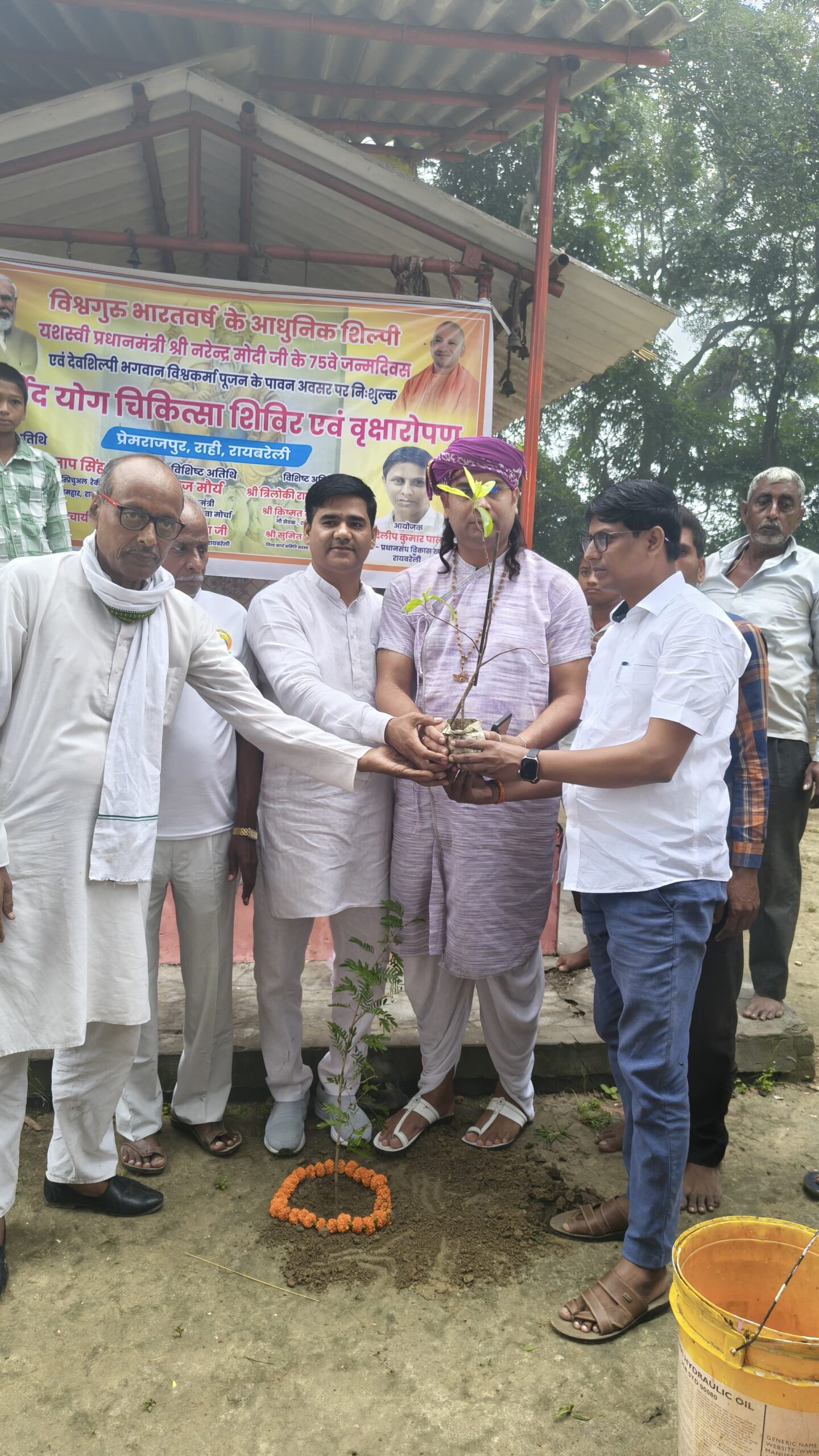 रायबरेली। भारत देश को तीव्र गति से चहुमुखी विकास की ओर अग्रसित करने वाले अथवा नव भारत के र्निमाता/ देश के यशस्वी माननीय प्रधानमंत्री नरेन्द्र मोदी जी के 75वें जन्म दिवस एवं देव शिल्पी भगवान विश्वकर्मा पूँजा के पावन अवसर पर आज दिनांक 17 सितम्बर 2025 को प्रधान संध अध्यक्ष श्री दिलीप कुमार पाल द्वारा ग्राम पंचायत प्रेमराजपर के शैरिन माता जी के मन्दिर प्रांगण में ग्रामीणों को निःशुल्क आर्युवेद योग चिकित्सा शिविर एवं वृक्षारोपण का आयोजन किया गया। मंन्दिर में पुजा अर्चना कर योग शिविर का शुभारम्भ किया गया। योग शिविर में योग गुरू डा० श्री रवि प्रताप सिंह जी की गरिमामयी उपस्थित में ग्रामीणों को योगाभ्यास करावाया गया। तथा योगाचार्यों द्वारा योगाभ्यास से होने वाले मानसिक / शारीरिक लाभ के बारें में भी जनसमूह को विस्तृत जानकारी दी गयी। योगाभ्यास के पश्चात मा० प्रधानमंत्री श्री नरेन्द्र मोदी जी का जन्मोत्सव भी बडें ही धूम धाम से मनाकर प्रसाद वितरण किया गया। उक्त अवसर पर मुख्य रूप से जिला महामंत्री अनूज मौर्य जी एवं अध्यक्ष प्रधान संघ श्री दिलीप कुमार पाल जी ने कार्यक्रम को सम्बोधित कर सरकार की योजनाओं से ग्रामीणों को अवगत कराया।