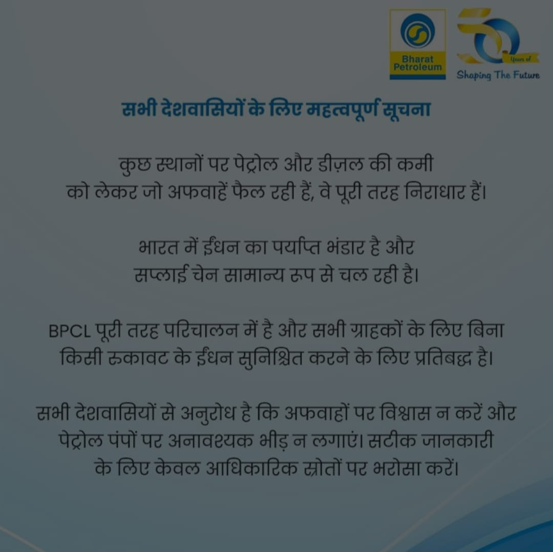 रायबरेली।अपर जिलाधिकारी (प्रशासन) सिद्धार्थ ने बताया है कि जनपद में कहीं भी किसी भी प्रकार की डीज़ल अथवा पेट्रोल की कोई समस्या अथवा शार्टेज नहीं है । पूर्व की भांति जनपद में डीजल एवं पेट्रोल की सप्लाई सामान्य है , डिपो के अधिकारियों से वार्ता की गई है, कहीं कोई समस्या नहीं है । यदि किसी पम्प संचालक अथवा उसके स्टाफ़ द्वारा कोई भ्रामक सूचना प्रसारित की जाती है तो संबंधित के विरुद्ध नियमानुसार कार्यवाही की जाएगी।