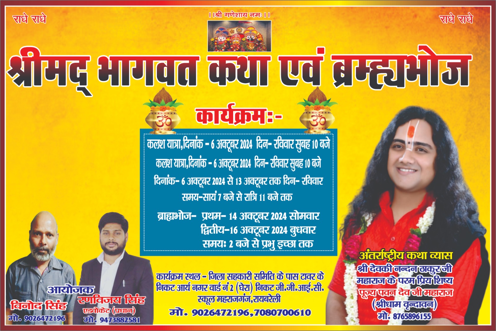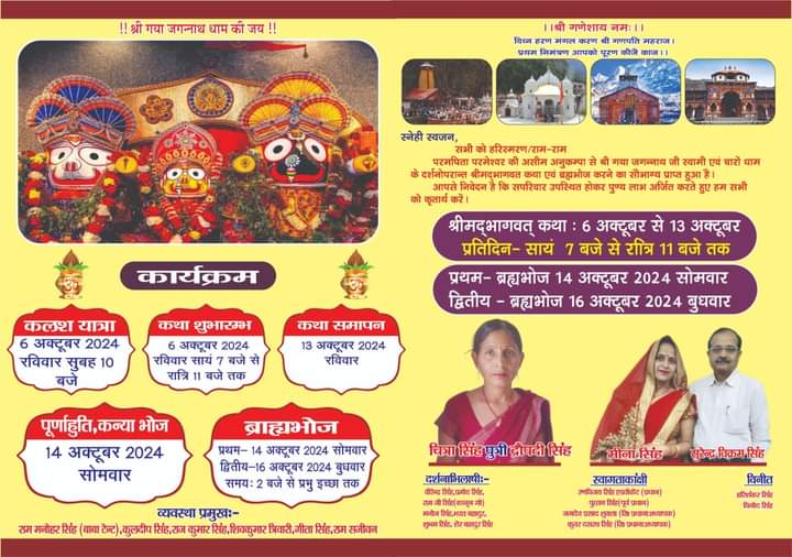 महाराजगंज रायबरेली। कस्बा क्षेत्र में वार्ड नंबर 2 आर्य नगर घेरा में श्रीमद् भागवत कथा एवं ब्रह्म भोज में आप सभी लोगों का सादर आमंत्रित है। आपको बताते चले की 6 अक्टूबर से 13 अक्टूबर तक समय शाम 7:00 बजे से 11:00 बजे रात्रि तक श्रीमद् भागवत कथा व 14 एवं 16 अक्टूबर को ब्रह्म भोज का कार्यक्रम किया गया है। कार्यक्रम स्थान टाउन एरिया महाराज से निकट जीजीआईसी स्कूल जिला सहकारी समिति टावर के पास वार्ड नंबर 2 आर नगर घेरा महाराजगंज में अंतरराष्ट्रीय कथा वाचक श्री देवकीनंदन महाराज के परम प्रिय शिष्य पवन देव महाराज जी (*श्री धाम वृंदावन*) द्वारा होगी जिसमें आप सभी क्षेत्र वीडियो गरमा में उपस्थिति अनिवार्य है जिससे आप सभी लोगों का आशीर्वाद प्राप्त होगा।