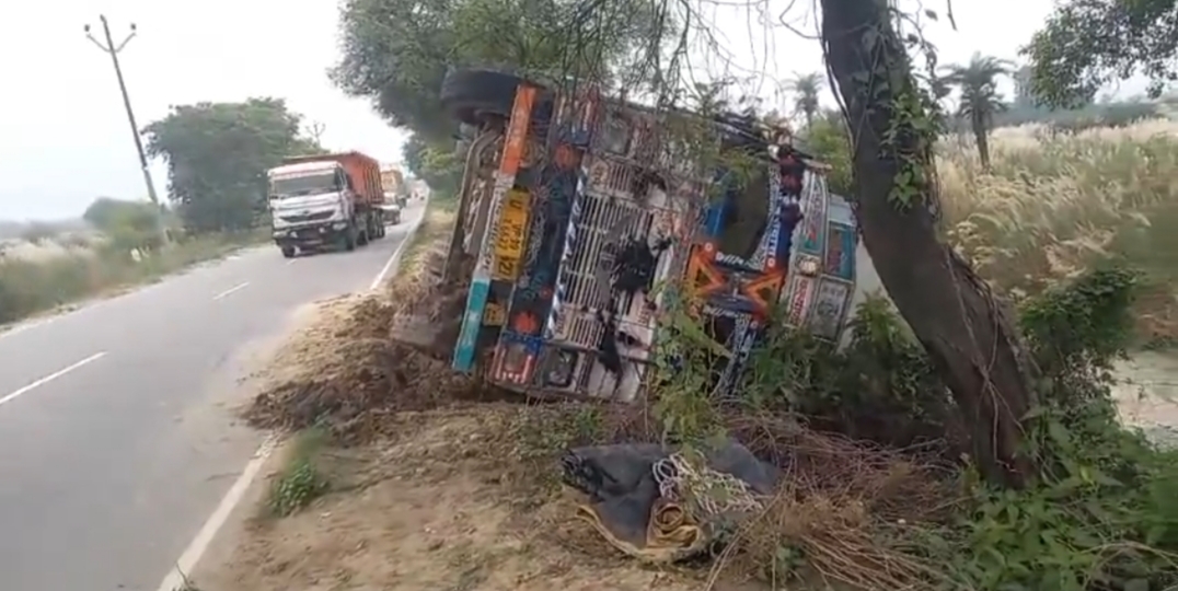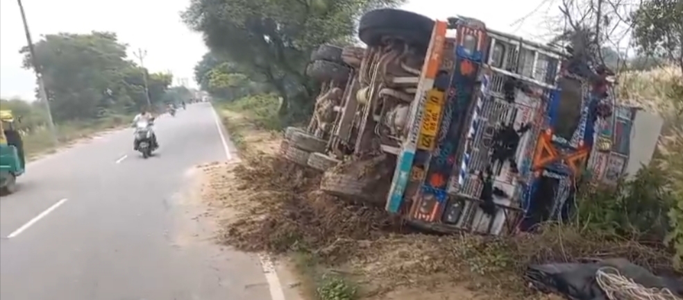 एक ट्रक सामने से आ रहे ट्रक से बचने के चक्कर में मौरंग से लोड ट्रक अनियंत्रित होकर खाई के किनारे जाकर पलट गया